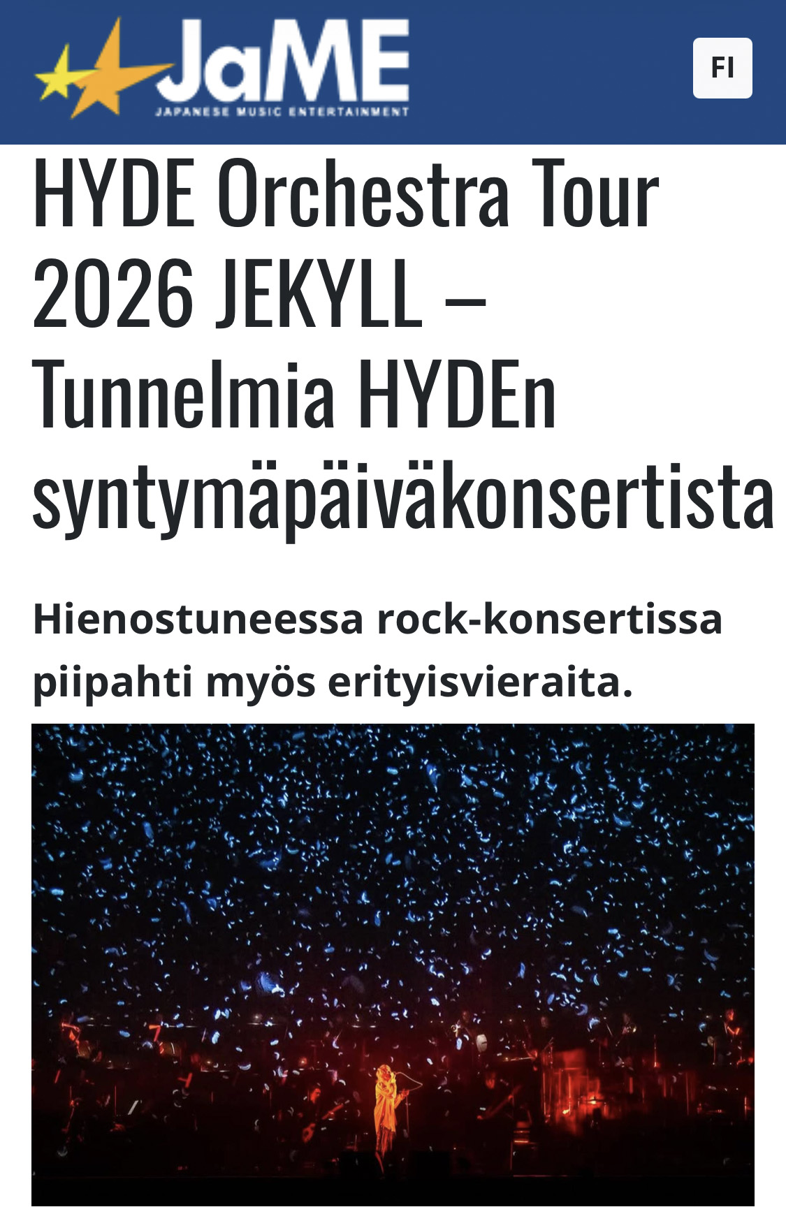 International coverage of Japanese rock star HYDE’s concert performance from “HYDE Orchestra Tour 2026 JEKYLL” at Tokyo Garden Theater, presented by Live Viewing Japan. JRock News (UK) https://jrocknews.com/2026/01/report-hyde-birthday-with-hyde-orchestra-tour-2026-jekyll-global-livestream.html JaME (Finland)...